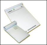Format: DIN A4 oder A5 Papier: Offset, h'frei, weiß, 80 g Umfang: 50 Blatt auf Kartonunterlage 300 g Druck: individuell 1- bis 4-farbig Offset am Kopf oder seitlich Verarbeitung: auf Kartonunterlage geleimt